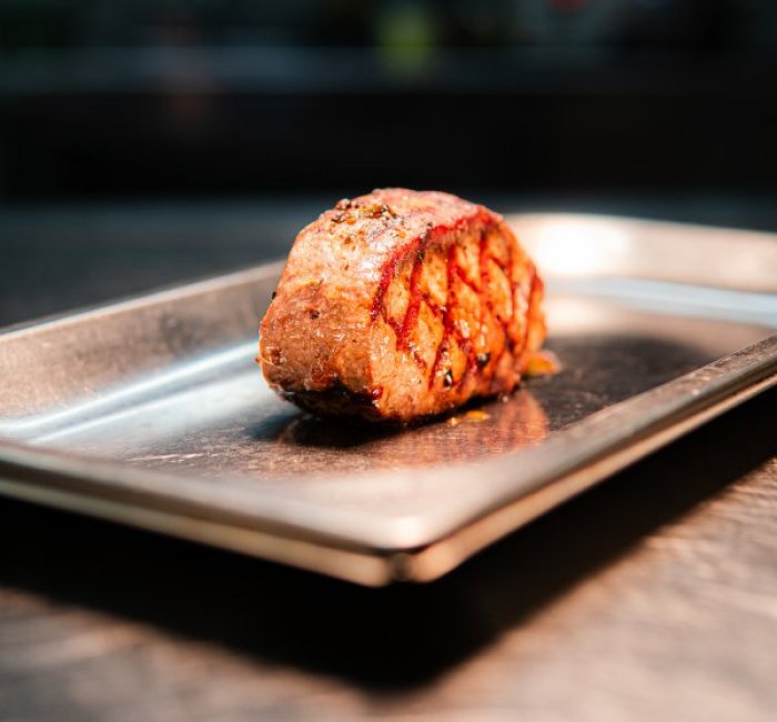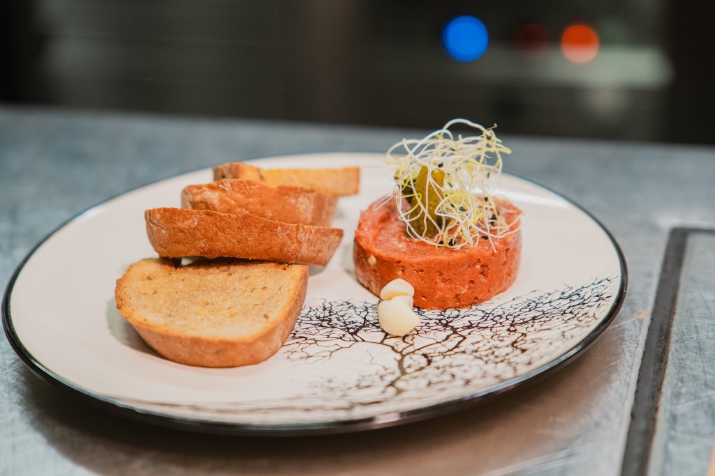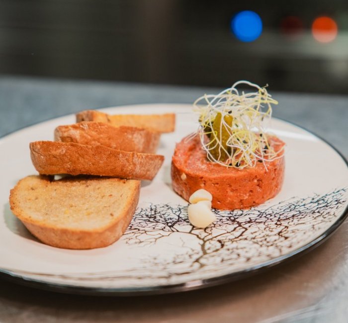 | 76g | TATARÁKhovězí roštěná, červená cibulka, naše pikantní marináda, topinky s kváskového chleba pečené nasucho s česnekovým máslem, mini okurčičky cornichons |