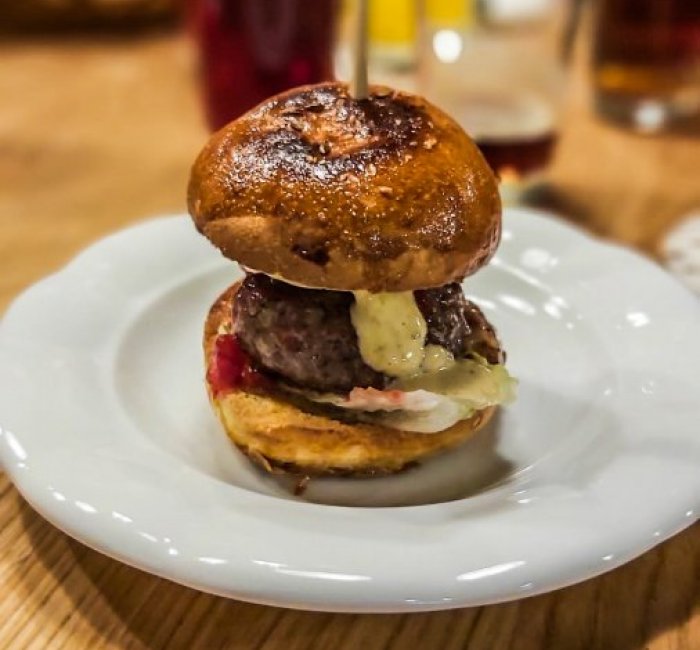 | 196g | WAGYU BURGERmleté hovězí z plemene wagyu, slaninový chips, čedar, smažené bramborové hranolky, římský salát, smoke mayo, nakládaná okurka, máslová brioška |